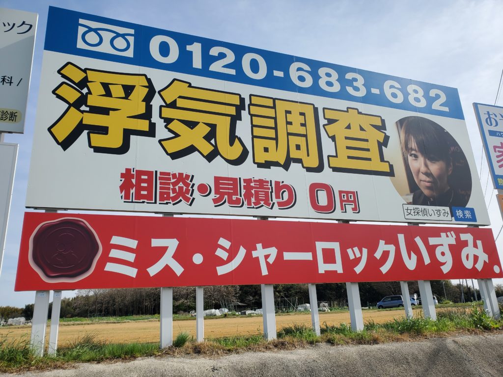 東京市の東バイパスから光の森に入る道にもミス・シャーロック.いずみの看板があります。